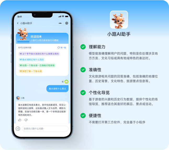 AI文旅行業模型是一款綜合性人工智能應用,旨在提升旅游體驗和優化內容創作。基于大模型生成式智能問答、個性化伴游助手、行文助手(標題取名、文章潤色、文章摘要、關鍵詞提取)、圖像識別、文轉語音等。
